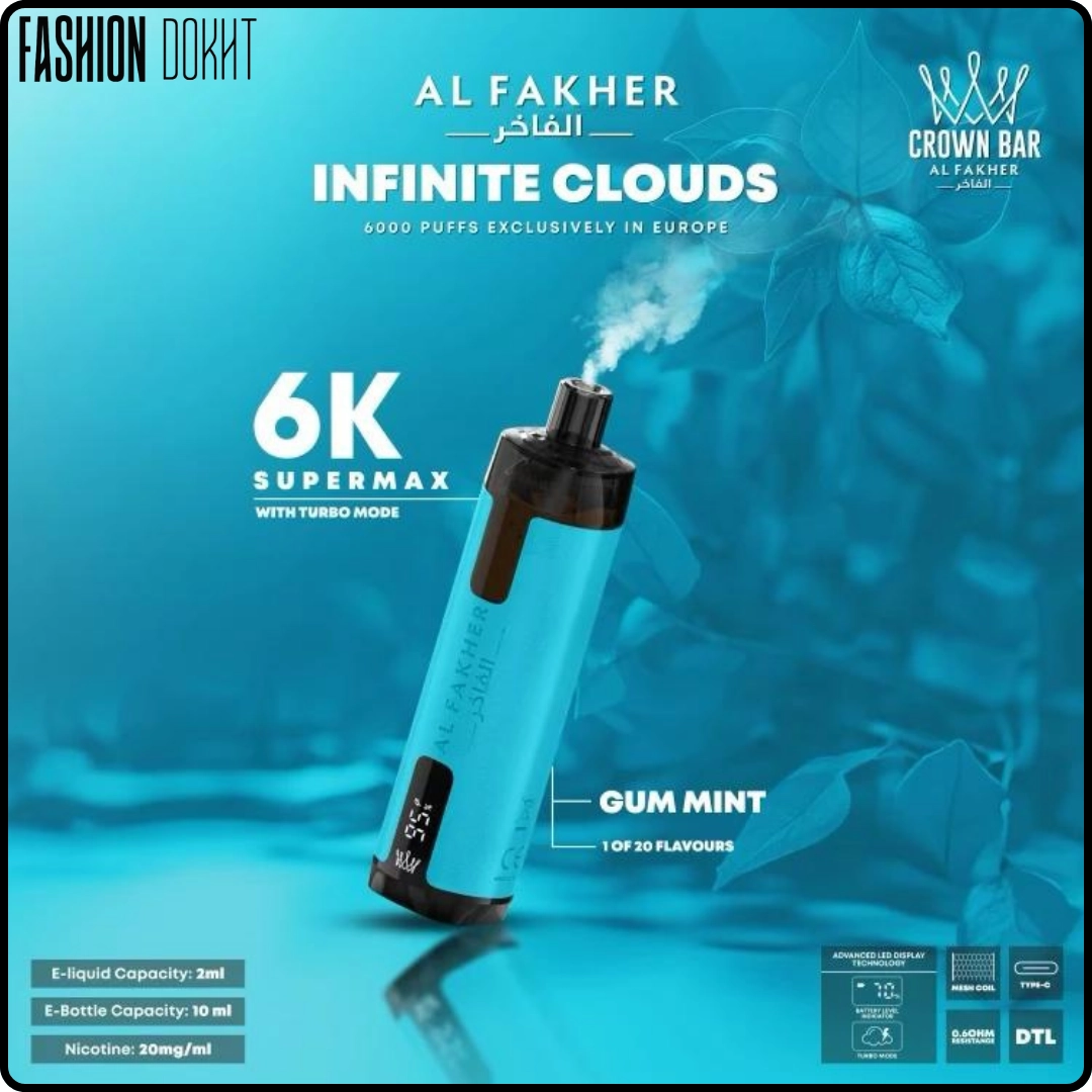 پاد یکبار مصرف الفاخر 6000 پاف ادامس نعنا یخی | تازگی قطبی (نیکوتین پریمیوم • مخزن 12ml • نمایشگر باتری • برند الفاخر)